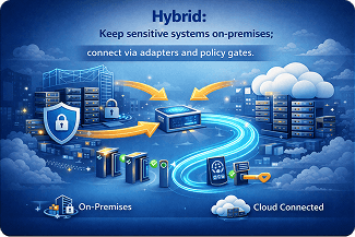 Keep sensitive systems on-prem; connect via adapters and policy gates.